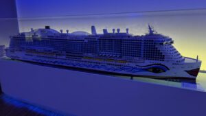 Danach kommt man in einen Raum, in welchem zahlreiche Modelle von Kreuzfahrtschiffen der letzten 40 Jahre originalgetreu nachgebaut stehen. Durch den einheitlichen Maßstab von 1:200 kann man sehr gut sehen, wie riesig die Kreuzfahrtschiffe heutzutage sind. Für uns natürlich auch sehr schön, da wir bereits zahlreiche Kreuzfahrten mit AIDA unternommen haben. Man sieht hier ein Modell der so genannten Sphinx-Klasse mit dem ausladenden Theatrium in der Mitte. Demgegenüber steht ein Modell der AIDAnova, dem derzeit größten Schiff der Flotte.
