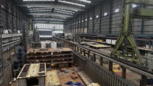 Auf dem Gelände findet man dann noch mehrere kleinere Hallen: hier werden im Wesentlichen die Stahlschnitte und Schweißarbeiten durchgeführt. Diese Arbeiten sind der Hauptteil an Arbeiten, die auf der Werft durchgeführt werden müssen.