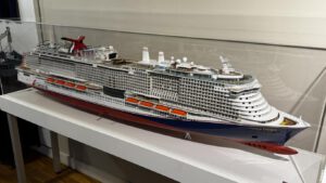 Danach kommt man in einen Raum, in welchem zahlreiche Modelle von Kreuzfahrtschiffen der letzten 40 Jahre originalgetreu nachgebaut stehen. Durch den einheitlichen Maßstab von 1:200 kann man sehr gut sehen, wie riesig die Kreuzfahrtschiffe heutzutage sind. Für uns natürlich auch sehr schön, da wir bereits zahlreiche Kreuzfahrten mit AIDA unternommen haben. Man sieht hier ein Modell der so genannten Sphinx-Klasse mit dem ausladenden Theatrium in der Mitte. Demgegenüber steht ein Modell der AIDAnova, dem derzeit größten Schiff der Flotte.