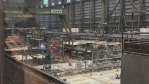 Leider liegt aktuell kein größeres, fast fertiges Schiff in den Docks der Werft. Trotzdem kann man sehr gut erkennen, dass die modernen Schiffe alle in der Blockbauweise entstehen: dies bedeutet, dass größere Elemente/Blöcke der Schiffe erst in anderen Hallen gebaut werden und dann als fertiger Block im Dock an das bestehende Schiff geschweißt werden.