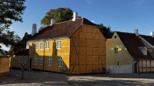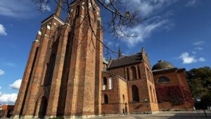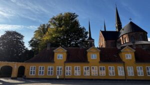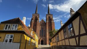 Der Dom steht zentral in der Stadt Roskilde auf einem kleinen Hügel und überragt somit die Umgebung. Rundherum findet man die typischen dänischen, gelben Fachwerkhäuser, die im Sonnenlicht strahlen.