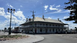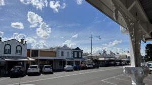 Die Hauptstraße selber ist eigentlich typisch für Australien: vor den Geschäftshäusern sind fast überall überdachte Laubengänge über den Bürgersteig. Die Straße ist recht breit, so dass beidseitig tiefe Parktaschen entlang der Straße sind. Hier fährt man im Allgemeinen immer mit dem Auto in die Stadt, d.h. Parkplätze werden in großer Zahl benötigt. Das typische Auto der Einheimischen ist natürlich ein geländefähiger Pick-Up, Kleinwagen sieht man hier so gut wie gar nicht.