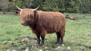 Direkt am Ortsausgang verlässt man nahe einer kleinen Kapelle den asphaltierten Weg und biegt rechts in den Wald ab. Der Waldweg zum See verläuft nahezu immer am Waldrand entlang und folgt einem Gebirgsbach in Richtung See. Kurz nach der Kapelle kamen wir noch an einem Gehege mit Hochlandrindern vorbei.