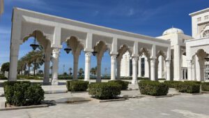 Im weitläufigen Außengelände kann man durch viele Laubengänge mit Torbögen spazieren gehen. Meistens hat man einen fantastischen Blick auf die Hochhäuser der Metropole Abu Dhabis.