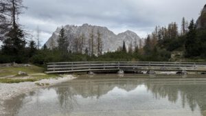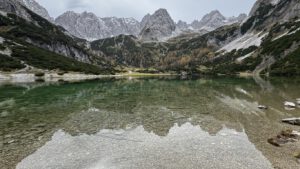 Trotz dass es sich mittlerweile zugezogen und bewölkt hatte, schimmerte der See in all seinen glasklaren Türkis- und Grüntönen. Das rundherum liegende Bergmassiv des Wettersteingebirges spiegelte sich traumhaft im klaren Seewasser. Man kann sich nur wage vorstellen, wie die Farben bei klarem Sonnenschein aussehen mögen.