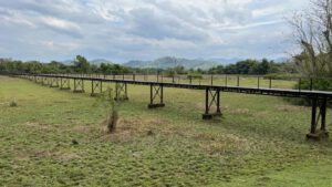 Wieder nur ein paar Fahrminuten weiter liegt die Bun Sung Iron Bridge. Sie gilt als bekanntes Monument in dem Distrikt Takua Pa und stammt aus der Zeit nachdem die Zinnminen auf der anderen Flussseite stillgelegt wurden. Die Im Jahre 1968 komplett aus Eisen erbaute Brücke ist rund 200 Meter lang und überspannt einen Fluss sowie weite Teile des flachen Flussufers, da dieses regelmäßig überschwemmt wird. Die Brücke ist gerade so breit gebaut, dass 2 Motorräder knapp aneinander vorbeipassen. Sie ist ein typisches Touristen-Fotomotiv.