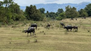 Kurz bevor wir weiterfahren wollten, kam aus dem Fluss noch eine riesige Herde von Wasserbüffeln, die durch das Gras am Flussufer direkt unter uns unter der Brücke durchzogen. Es sind sehr beeindruckende Tiere mit ihren bis zu einem Meter langen Hörnern.
