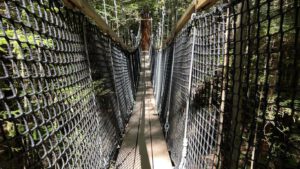 Dieser Wanderweg hoch oben in den Bäumen ist 700 Meter lang, erstreckt sich über 28 Hängebrücken und 27 Plattformen und dauert rund 40 Minuten. Mit einer Höhe des Gehwegs zwischen 9 und 20 Metern bietet sich eine einzigartige Vogelperspektive auf den Wald unten und die Baumwipfel oben.