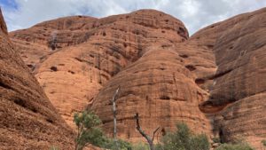 Bei den etwas durchwachsenen Wetteraussichten haben wir uns für den Kata Tjuta entschieden. Kata Tjuta ist eine Gruppe von 36 Felskuppen, die bis zu 564 Metern aus der Wüstenlandschaft herausragen. Der Name stammt vom Stamm der Anangu (Aborigines): Kata steht für Kopf und Tjuta für viele – demnach bedeutet Kata Tjuta viele Köpfe, was auch sehr gut passt. Wir hatten bereits im Laufe des Tages gesagt, dass die Felshöhlen in den Sandsteinhügeln aussehen wie Gesichter. Ob dies zum geschichtlichen Ursprung passt, wissen wir natürlich nicht.