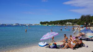 Den halben Tag haben wir in dieser weitläufigen Badebucht verbracht. Hier konnte man entspannt in feinem Kieselsand liegen und auch sehr flach ins Meer hineingehen, sogar überwiegend auf Sandboden mit nur vereinzelten Steinen – in Kroatien echt eine Seltenheit.